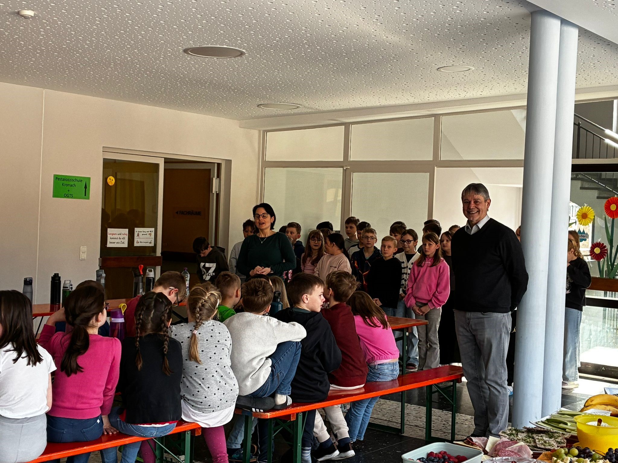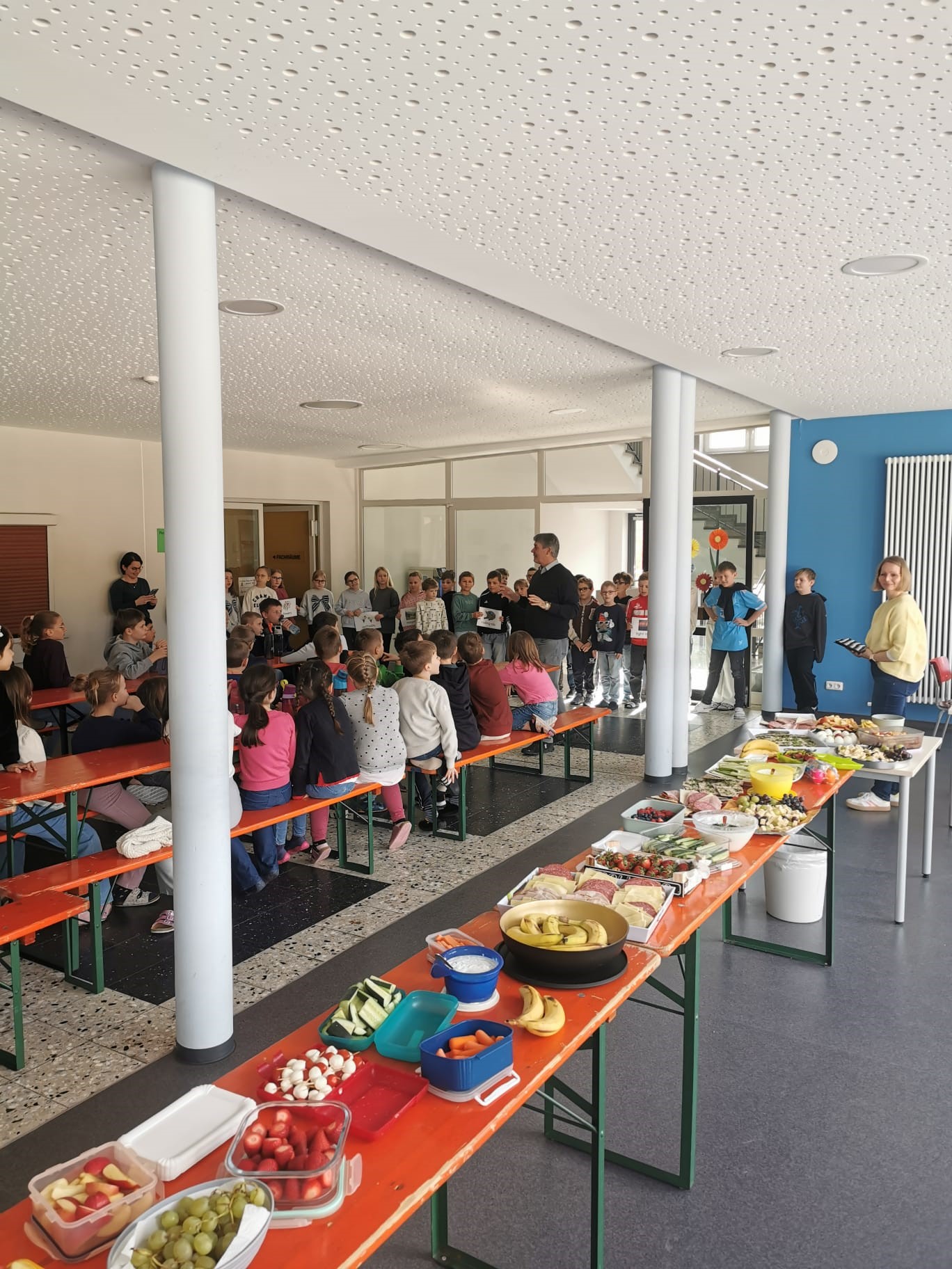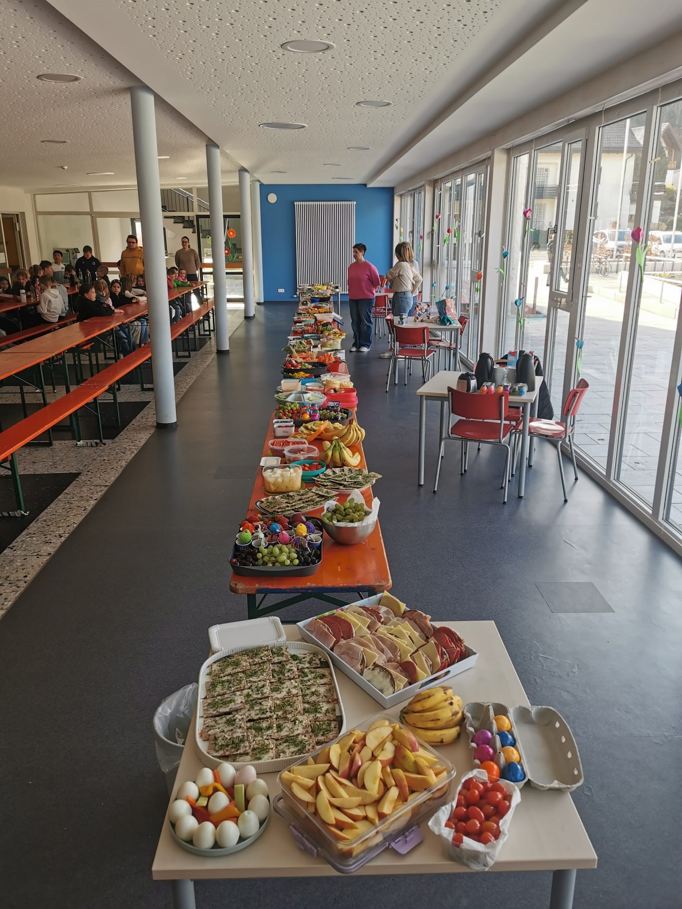 Am letzten Schultag vor den Osterferien lud unser Elternbeirat zu einem gesunden und leckeren Osterfrühstück ein. Da uns die eisigen Temperaturen leider einen Strich durch die Rechnung gemacht haben, wurde kurzerhand das Osterfrühstück nach "drinnen" verlegt.