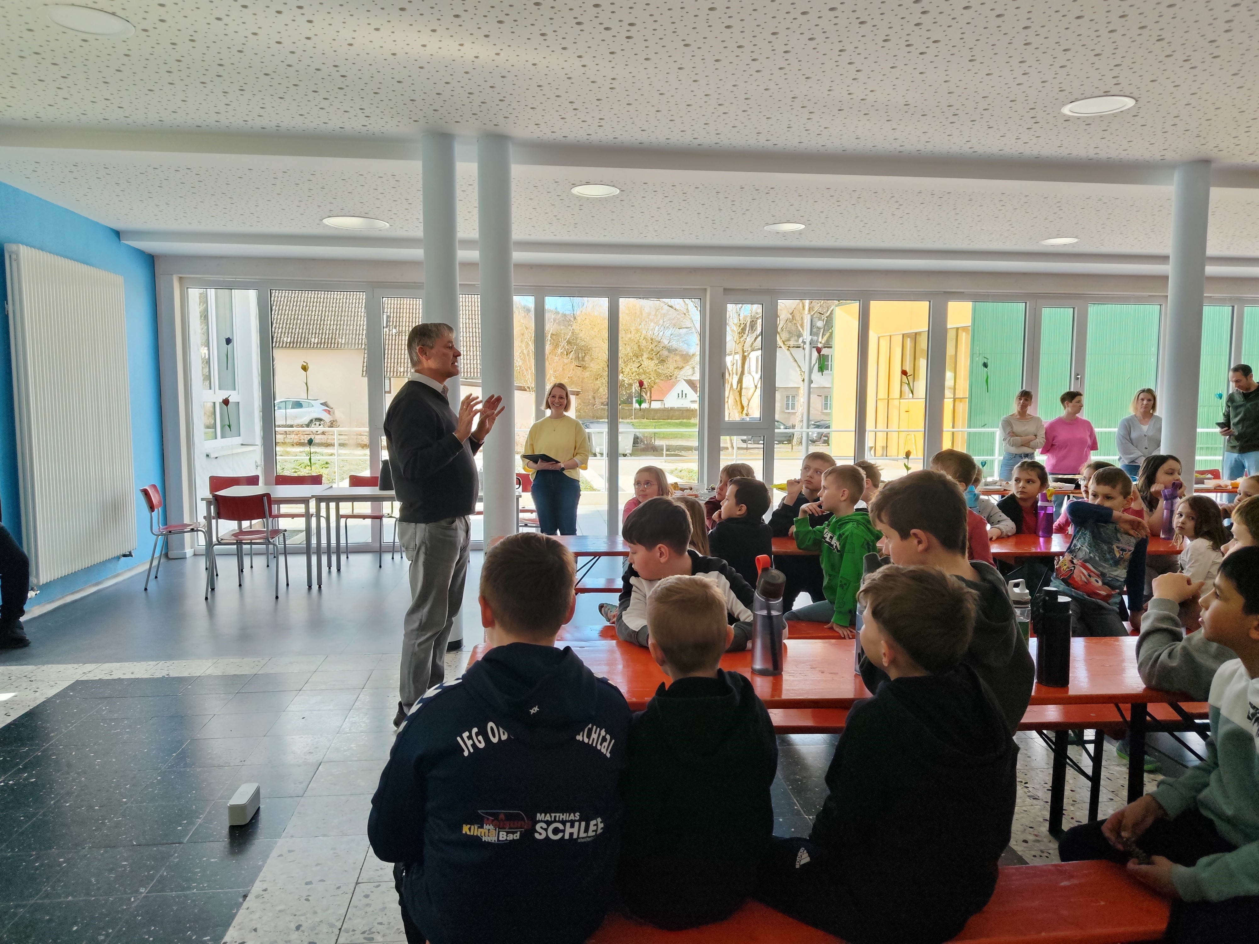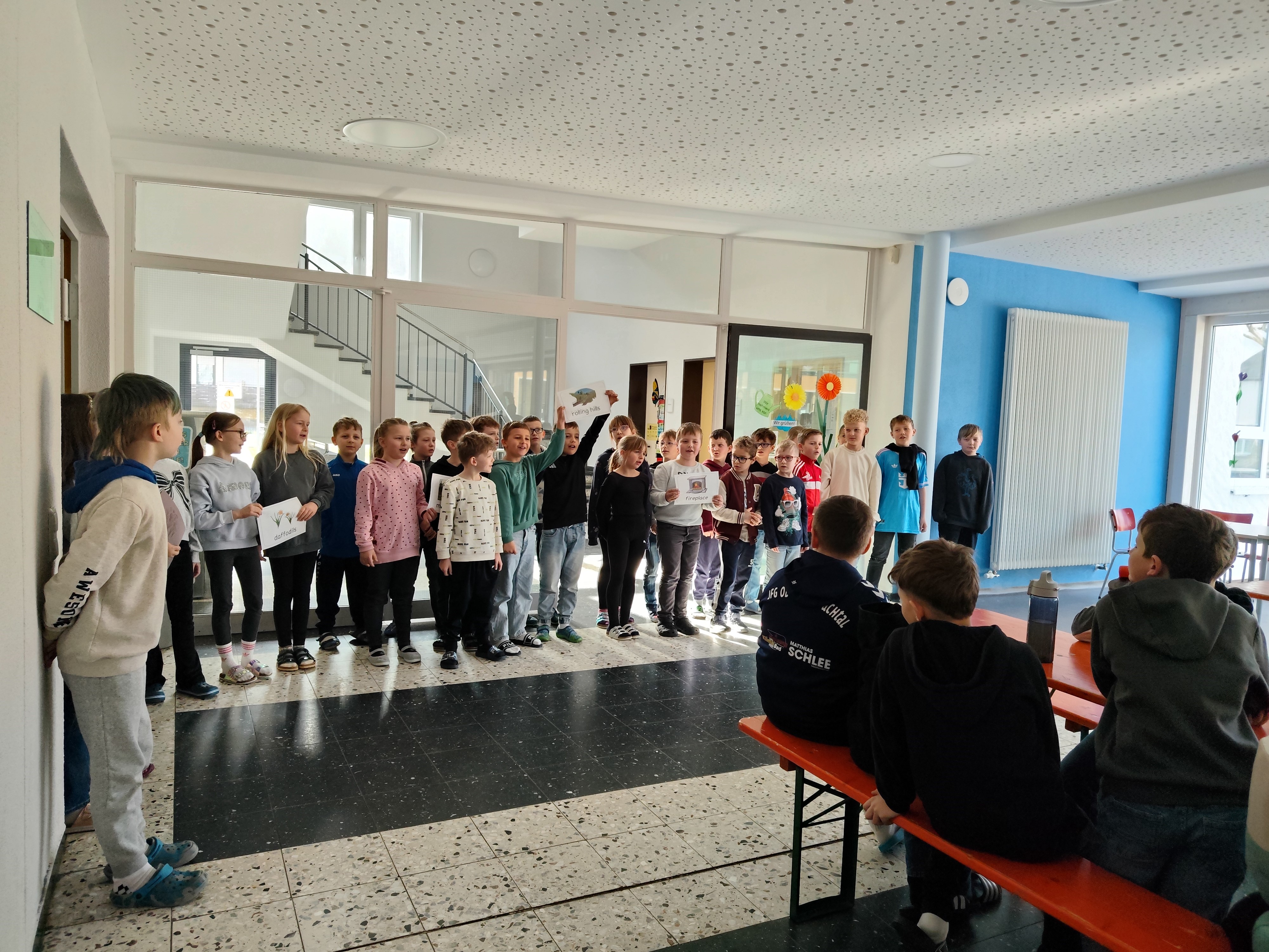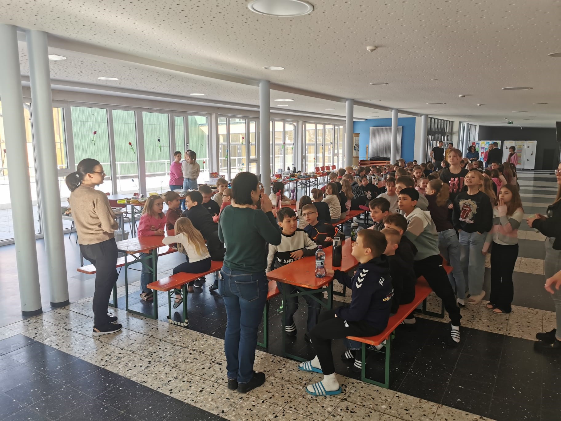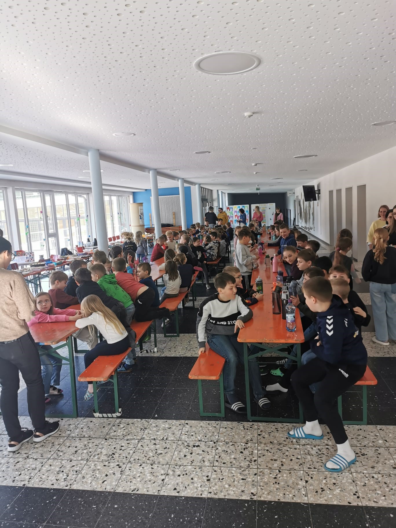 Am letzten Schultag vor den Osterferien lud unser Elternbeirat zu einem gesunden und leckeren Osterfrühstück ein. Da uns die eisigen Temperaturen leider einen Strich durch die Rechnung gemacht haben, wurde kurzerhand das Osterfrühstück nach "drinnen" verlegt.